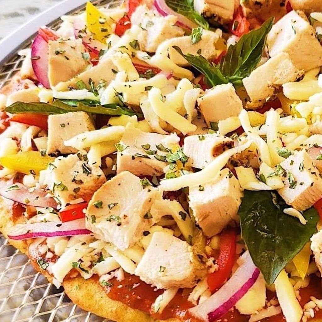 Almond crust, organic farm chicken, red pepper, red onion, cheese blend, and homemade Keto Texas BBQ sauce.