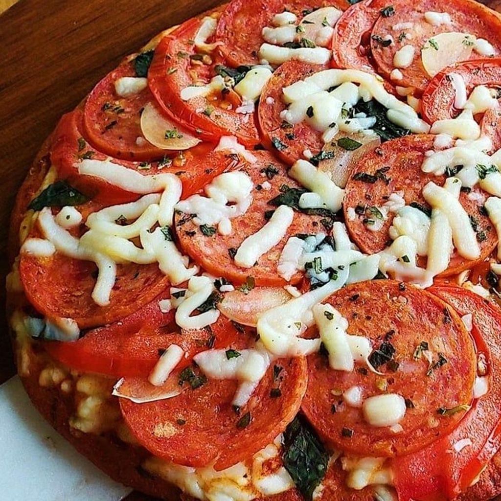 Almond crust, turkey pepperoni, garlic, tomatoes, basil, cheese blend and homemade keto marinara sauce.